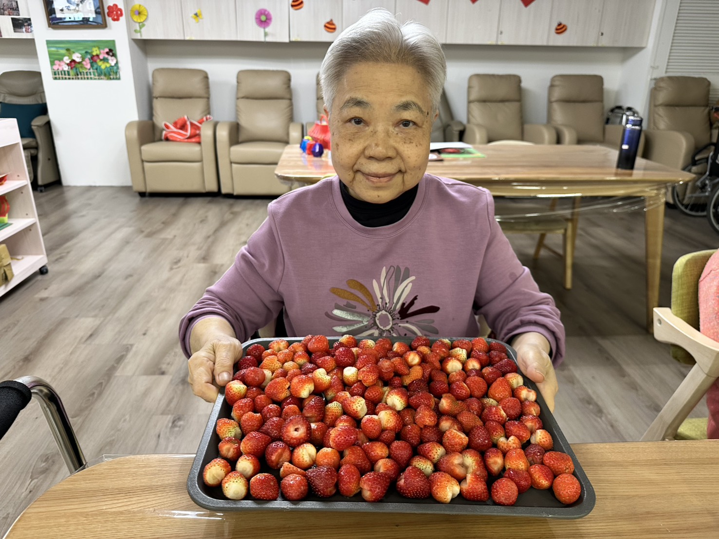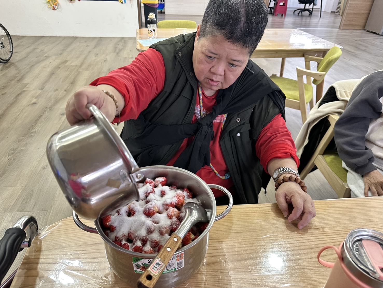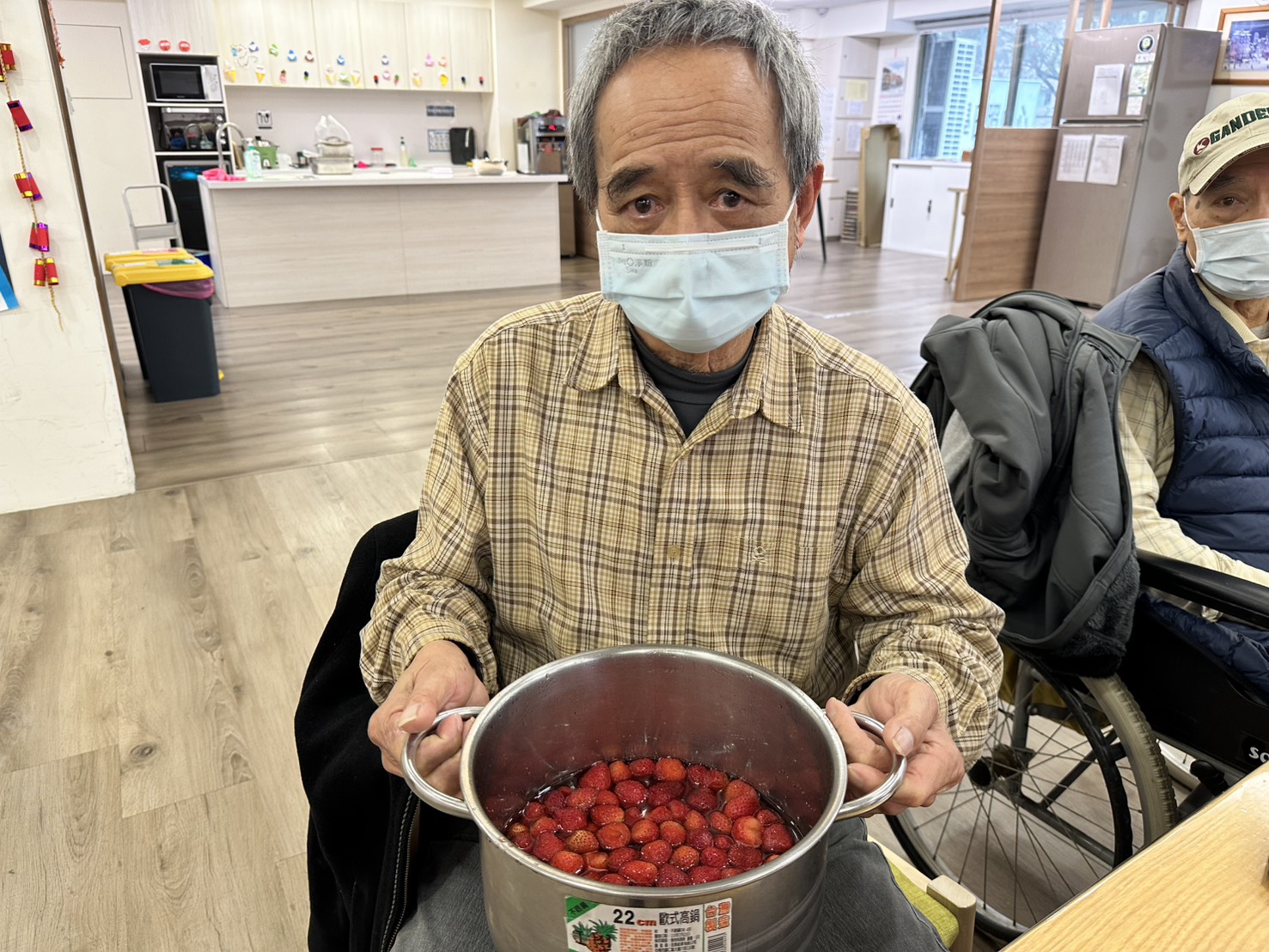 帶長輩們一起製作草莓果醬,長輩們一聞到草莓香味就笑著說:「好想吃一口喔!」在幫忙處理草莓前,還有長輩忍不住偷偷拿了一顆先嚐嚐看,有人說酸、有人說甜,大家邊聊天邊分享味道,氣氛十分熱鬧。🍓