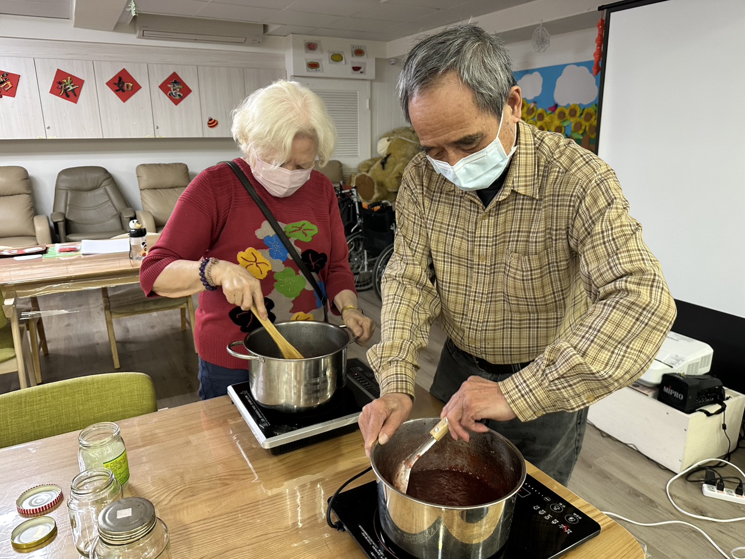 接著大家一起幫忙攪拌熬煮果醬,邊煮邊聞著香味直說:「哇~好香喔!」草莓果醬完成後,我們也準備了吐司一起做成草莓吐司來品嚐,長輩們都說「好好吃!」還笑著說自己做的就是特別不一樣,整個中心都充滿甜甜的草莓香與歡樂的氣氛。😊